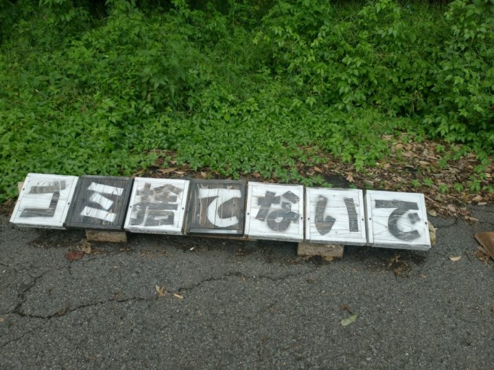 このような場所では、赤や黄色を使った厳格な感じの字体で書かれた【不法投棄禁止】の看板は時々見かけます。