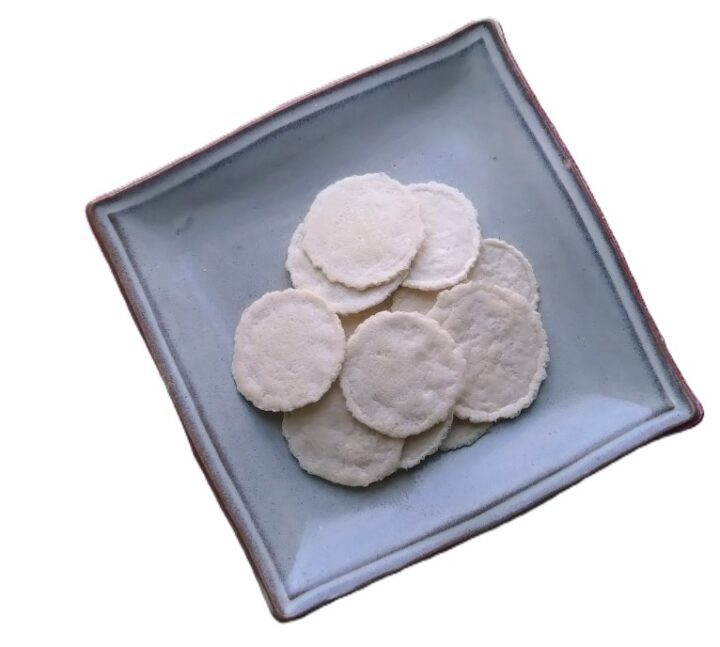 成型して揚げる前のすり身を生地に練り込み、うすしお味の煎餅に焼き上げました。